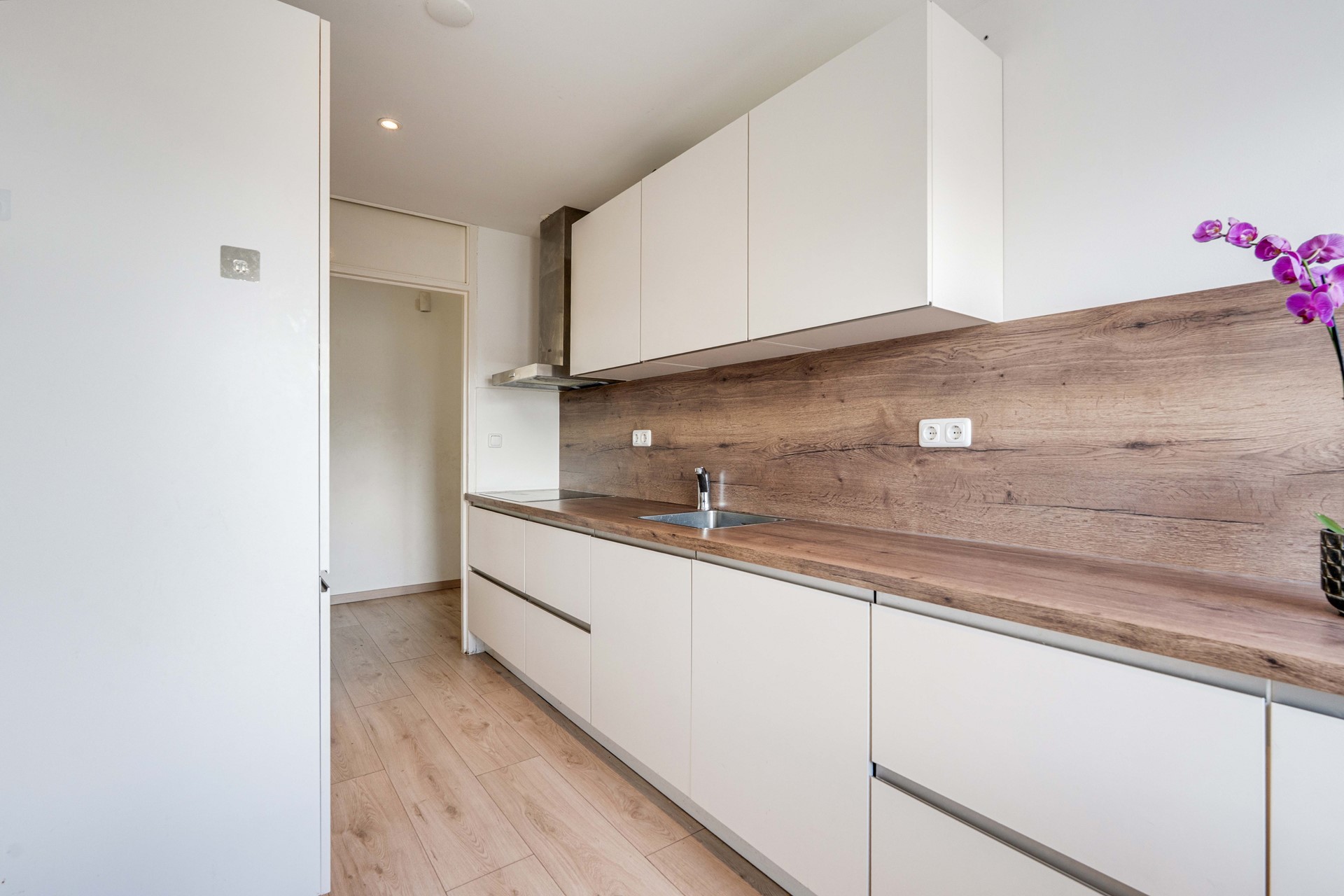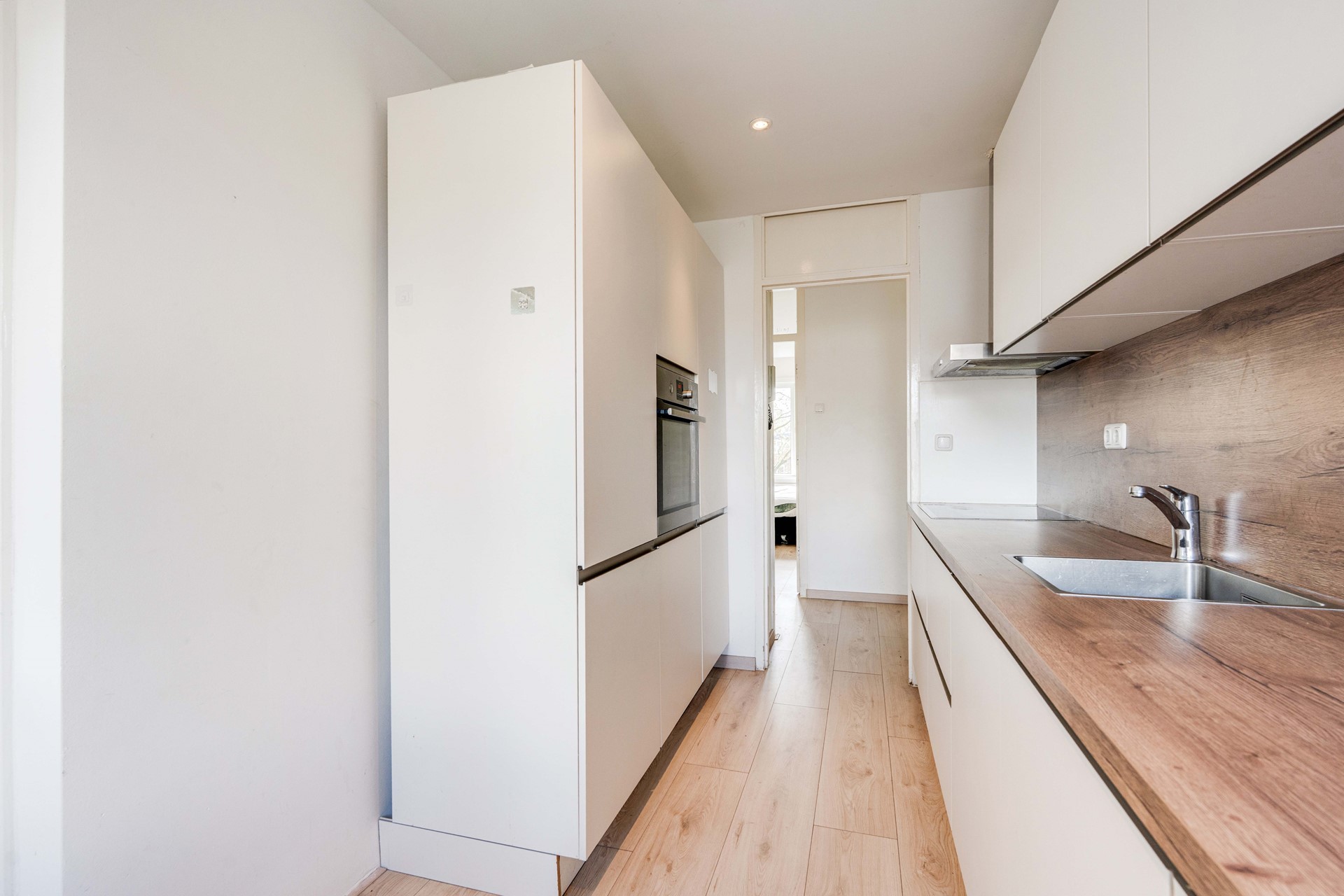 De woonkamer zelf is een lichte, ruime kamer met een buitendeur die naar het eerste balkon leidt. Dit balkon is ruim en ligt zonnig op het zuidwesten. Dat betekent dat je daar ook nog in de avond van de zon kan genieten. Het kleinere, tweede balkon is te bereiken via de moderne keuken. De keuken is van alle gemakken voorzien. Het is ingericht met strakke witte keukenkasten en een houten design werkblad. Hier is het heerlijk koken met inbouwapparatuur, inductiekookplaat en meer.