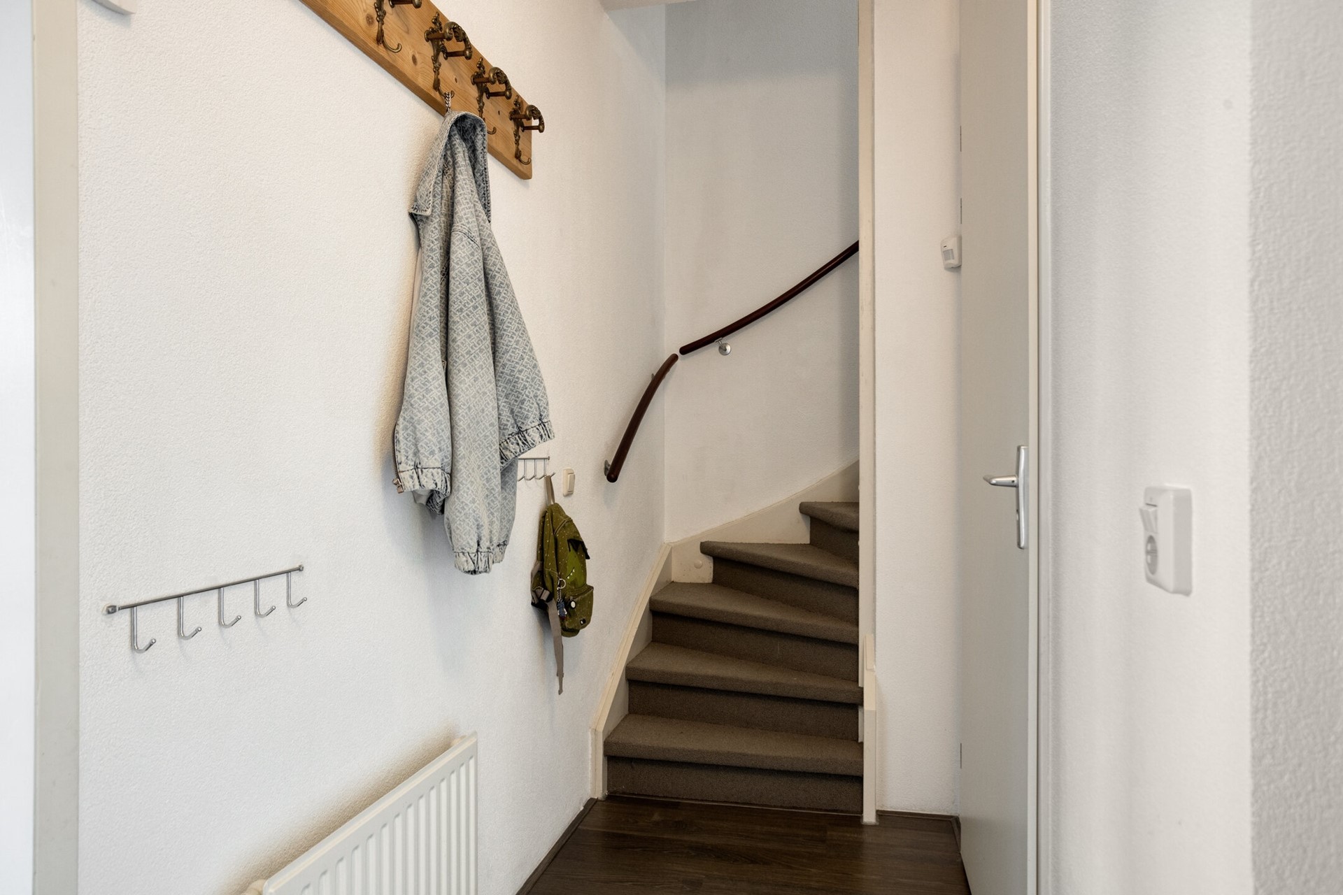 Overdekte entree, ruime hal met meterkast en toilet met fonteintje. Aan de rechterzijde bevindt zich de woonkamer en aan de linkerzijde de keuken.