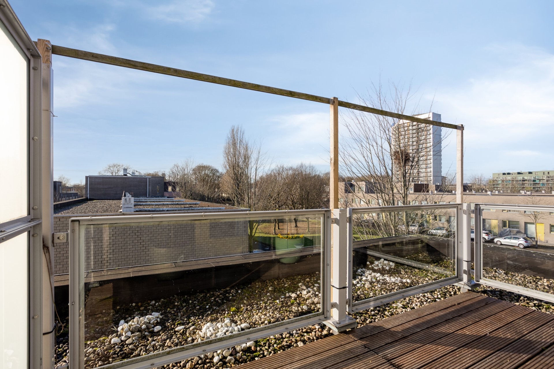 Deze lichte hoekwoning met dakterras is verdeeld over drie bouwlagen en heeft een ruime, open ligging, omgeven door groenvoorzieningen. Vanaf het dakterras heeft men vrij uitzicht over de gehele wijk. Aan de voorzijde kijkt men vanuit de keuken en de bovenliggende kamers uit over een brede groenstrook; aan de kopzijde biedt de woning uitzicht op een plantsoen.
